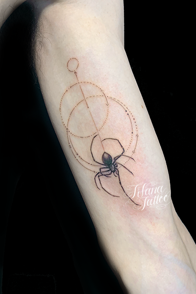 蜘蛛|ジオメトリックのファインライン・タトゥー タトゥー 一覧 > Tattoo by AKI 2023.11.07 蜘蛛|クモ、幾何学模様をひとつのデザインにまとめたファインライン・タトゥー。所要時間の目安は3時間前後です。 Style ファインライン メンズ 洋柄 Motif 昆虫 Tattoo Tag 蜘蛛、クモ Size iphoneサイズ Body parts 腕