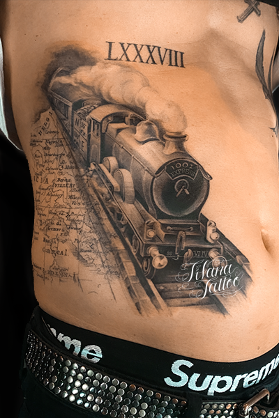 機関車|地図|ローマ数字のファインライン・タトゥー タトゥー 一覧 > Tattoo by Naoto 2023.05.16 蒸気機関車、線路、地図をひとつのデザインにまとめたファインライン・タトゥー。完成までの来店回数の目安は5回前後です。 Style ファインライン メンズ チカーノ・ブラック&グレイ 洋柄 Tattoo Tag 乗り物 機関車 Size B5サイズ以上 Body parts 脇 腹