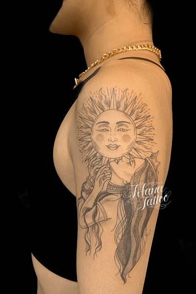 太陽と女神のタトゥー タトゥー 一覧 > Tattoo by Mica 2021.10.24 太陽、女神がモチーフのタトゥー。所要時間の目安は5時間前後です。 Style ガールズ 洋柄 Motif 女神 宇宙 Size B5サイズ以上 Body parts 腕