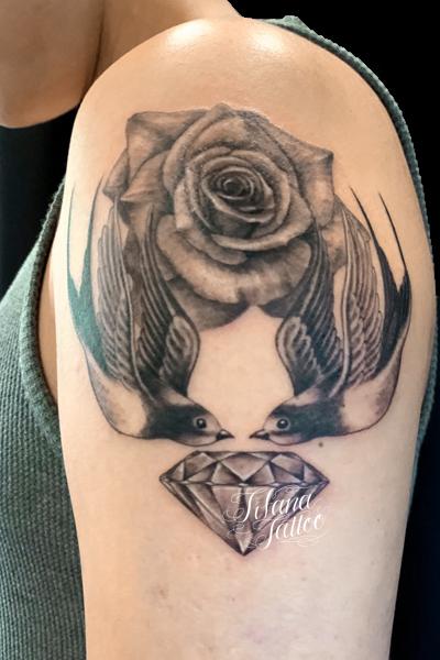 薔薇|燕|ダイヤのタトゥー タトゥー 一覧 > Tattoo by Mica 2020.04.29 薔薇|バラ、燕|ツバメ、ダイヤのモチーフをひとつのデザインにまとめたタトゥー。所要時間の目安は3時間半前後です。 Style メンズ 洋柄 Motif アクセサリー 鳥 植物 シンメトリー Tattoo Tag ダイヤ 燕、ツバメ 薔薇、ローズ Size CDジャケット Body parts 肩