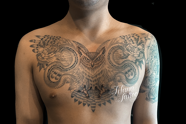 フクロウ |蛇のシンメトリー・タトゥー タトゥー 一覧 > Tattoo by Kaz 2023.04.28 梟|フクロウ 、蛇|ヘビをシンメトリーな構図にデザインしたタトゥー。完成までの来店回数の目安は5回前後です。 Style メンズ チカーノ・ブラック&グレイ 洋柄 Motif 鳥 爬虫類 植物 シンメトリー Tattoo Tag 梟、フクロウ 蛇、ヘビ Size B5サイズ以上 Body parts 胸