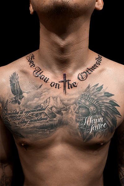 シンメトリー・タトゥー タトゥー 一覧 > Tattoo by Naoto 2024.01.23 既存のタトゥーに文字|レタリング、クロスをシンメトリーな構図にデザインしたチカーノ・タトゥー。 Style メンズ チカーノ・ブラック&グレイ レタリング 洋柄 Motif クロス 文字・数字 シンメトリー Size B5サイズ以上 Body parts 胸