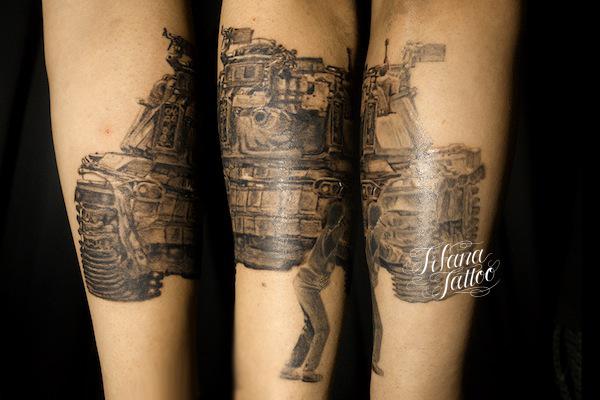 戦車のタトゥー タトゥー 一覧 > Tattoo by Mica 2019.06.17 戦車のモチーフと人物をひとつのデザインにまとめたタトゥーです。所要時間の目安は10時間前後です。 Style メンズ チカーノ・ブラック&グレイ 洋柄 Motif 武器 Size B5サイズ以上 Body parts 腕