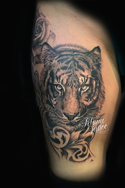 虎のファインライン タトゥー タトゥー 一覧 > Tattoo by Kaz 2021.02.01 虎|トラの顔のモチーフをファインラインで表現したリアリスティック・タトゥーです。所要時間の目安は15時間前後です。 Style ファインライン ガールズ チカーノ・ブラック&グレイ 洋柄 Motif 動物 Tattoo Tag 虎 Size B5サイズ以上 Body parts 脚