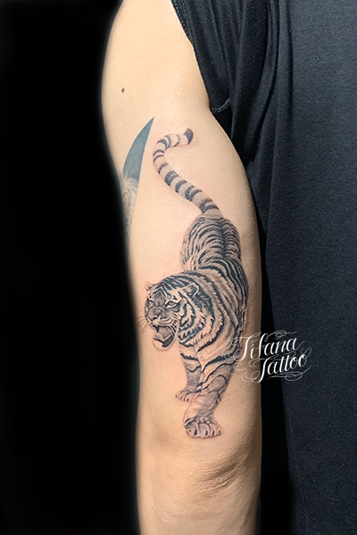 虎のファインライン・タトゥー タトゥー 一覧 > Tattoo by AKI 2023.10.14 虎|トラを繊細なデザインに仕上げたファインライン・タトゥー。所要時間の目安は7時間前後です。 Style ファインライン メンズ 洋柄 Motif 動物 Tattoo Tag 虎 Size CDジャケット Body parts 腕