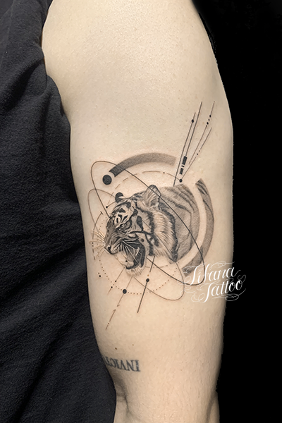 虎|ジオメトリックのファインライン・タトゥー 2024.02.25 虎|トラ、ジオメトリックな模様を繊細な技法で表現したファインラインタトゥー。完成までの施術時間の目安は6時間前後です。 Style ファインライン メンズ 洋柄 Motif 動物 図形 Tattoo Tag 幾何学模様 虎 Size CDジャケット Body parts 腕
