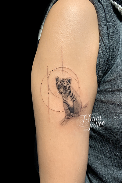 虎の赤ちゃんのファインライン・タトゥー タトゥー 一覧 > Tattoo by AKI 2024.03.30 トラ|虎の子供に幾何学模様を組み合わせたファインライン・タトゥー。所要時間の目安は6時間前後です。 Style ファインライン メンズ ガールズ 洋柄 Motif 動物 図形 ポートレイト Tattoo Tag 幾何学模様 虎 Size iphoneサイズ Body parts 腕