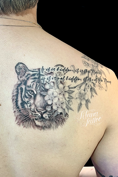 虎のタッチアップ・タトゥー タトゥー 一覧 > Tattoo by Kaz 2024.07.21 既存の植物のタトゥーに虎をタッチアップしたタトゥー。 Style メンズ チカーノ・ブラック&グレイ 洋柄 Motif 動物 Tattoo Tag 虎 Size B5サイズ以上 Body parts 肩