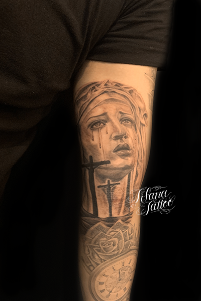 マリア様|ジーザス|マネーローズ|懐中時計のタトゥー タトゥー 一覧 > Tattoo by Mica 2023.12.16 マリア様、ジーザス|キリスト、マネーローズ、懐中時計をひとつのデザインにまとめたタトゥー。完成までの施術回数の目安は2回です。 Style メンズ チカーノ・ブラック&グレイ 洋柄 Motif クロス アクセサリー 世界の神様 Tattoo Tag キリスト、ジーザス マネーローズ 時計 聖母マリア Size B5サイズ以上 Body parts 腕