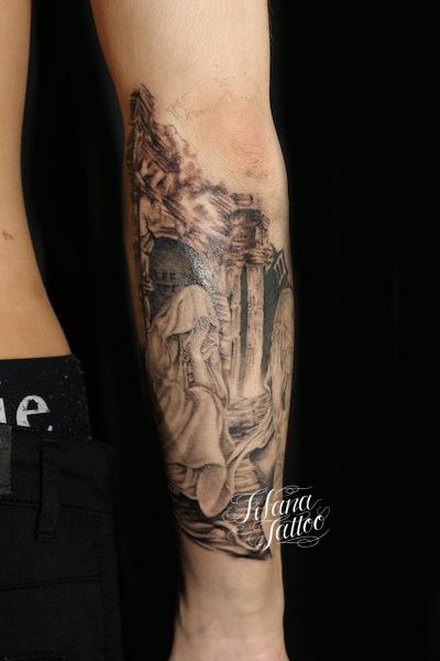 マリア様|宮殿のタトゥー タトゥー 一覧 > Tattoo by Kaz 2015.01.27 打ち拉がれるマリア様のモチーフの背景に宮殿をデザインしたタトゥー|刺青作品です。所要時間の目安は10時間前後、2回から3回で完成するサイズです。 Style メンズ チカーノ・ブラック&グレイ 洋柄 Motif 世界の神様 Tattoo Tag 聖母マリア Size B5サイズ以上 Body parts 腕