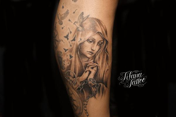 Virgin Mary TATTOO タトゥー 一覧 > Tattoo by Naoto 2020.01.10 既存のタトゥーにマリア様のモチーフをタッチアップしたチカーノタトゥー。所要時間の目安は4時間前後です。 Style メンズ チカーノ・ブラック&グレイ 洋柄 Motif 世界の神様 女神 Size B5サイズ以上 Body parts 脚