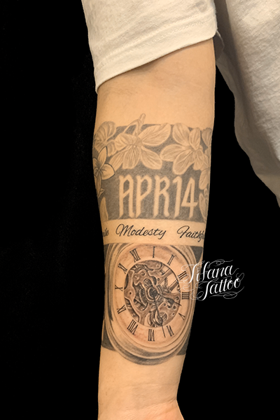 懐中時計|日付|メッセージのタトゥー タトゥー 一覧 > Tattoo by Mica 2024.06.13 懐中時計、日付、メッセージ|文字をひとつのデザインにまとめたタトゥー。完成までの施術回数の目安は2回です。 Style メンズ チカーノ・ブラック&グレイ 洋柄 Motif アクセサリー 文字・数字 Tattoo Tag 時計 Size B5サイズ以上 Body parts 腕