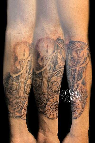 懐中時計|薔薇|砂時計|ロウソクのタトゥー タトゥー 一覧 > Tattoo by Kaz 2023.01.29 懐中時計、砂時計、薔薇、ロウソクをひとつのデザインにまとめたチカーノ・タトゥー。完成までの来店回数の目安は2回から3回です。 Style メンズ チカーノ・ブラック&グレイ 洋柄 Motif アクセサリー 植物 Tattoo Tag 時計 薔薇、ローズ Size B5サイズ以上 Body parts 腕