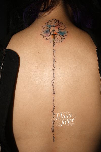 向日葵と文字のタトゥー タトゥー 一覧 > Tattoo by Mica 2017.12.09 水彩画調の向日葵|ヒマワリと筆記体の文字|レタリングをひとつのデザインにまとめたガールズタトゥーです。所要時間の目安は3時間前後です。 Style ガールズ レタリング 洋柄 Motif 文字・数字 植物 ロゴ・マーク Tattoo Tag 向日葵 水彩 Size B5サイズ以上 Body parts 背中