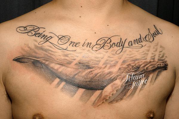 シロナガスクジラ|文字のタトゥー タトゥー 一覧 > Tattoo by Mica 2015.10.11 シロナガスクジラ|鯨のモチーフ、英文のメッセージをひとつのデザインにまとめた胸の部位のタトゥー|刺青作品です。所要時間の目安は10時間前後、2回で完成するサイズです。 Style メンズ チカーノ・ブラック&グレイ 洋柄 Motif 文字・数字 水の生き物 Tattoo Tag 鯨 Size B5サイズ以上 Body parts 胸