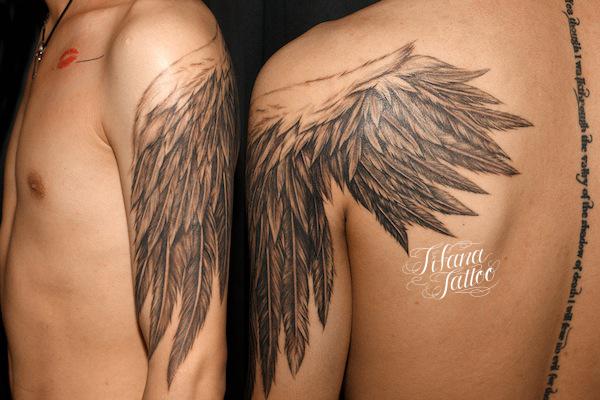 翼|羽のタトゥー タトゥー 一覧 > Tattoo by Naoto 2015.11.18 肩から腕にかけての構図で翼|羽のモチーフをデザインしたタトゥー|刺青作品です。 Style メンズ チカーノ・ブラック&グレイ 洋柄 Motif 羽・翼 Size B5サイズ以上 Body parts 肩 腕