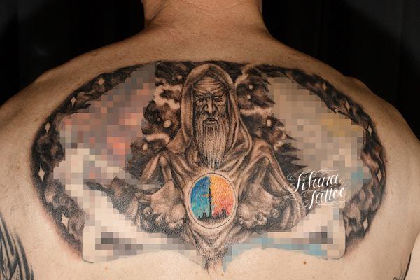WIZARD TATTOO タトゥー 一覧 > Tattoo by Kaz 2015.03.23 ウィザード|魔法使いがモチーフのタッチアップ・タトゥーです。手に持っているクリスタルボールには東京の街並み、全体の背景には宇宙をイメージした空をデザインしました。所要時間の目安は7時間前後、1回で完成しました。 Style メンズ 洋柄 Motif ファンタジー Size B5サイズ以上 Body parts 背中