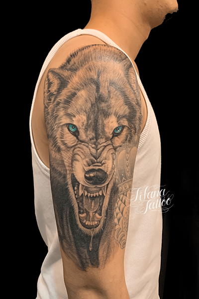 狼のハーフスリーブ・タトゥー タトゥー 一覧 > Tattoo by Mica 2022.12.13 威嚇する狼|オオカミがモチーフのハーフスリーブ・タトゥー。完成までの来店回数の目安は3回〜5回です。 Style メンズ チカーノ・ブラック&グレイ 洋柄 Motif 動物 Tattoo Tag オオカミ Size ハーフスリーブ Body parts 腕